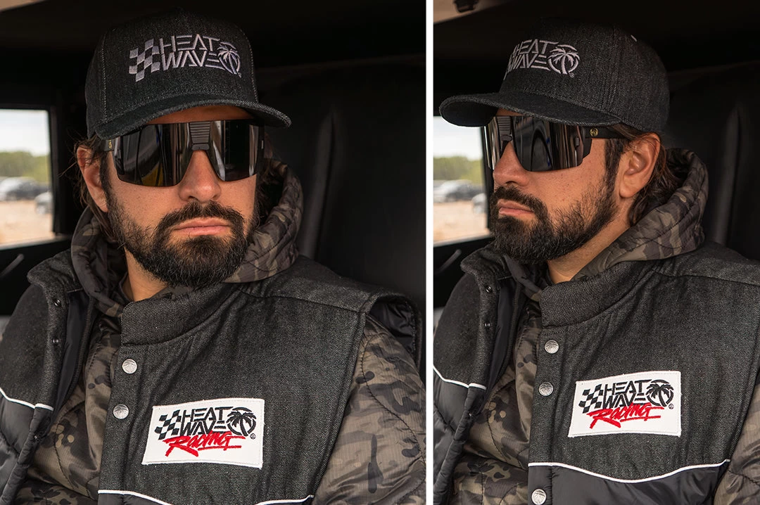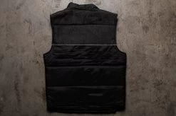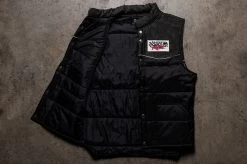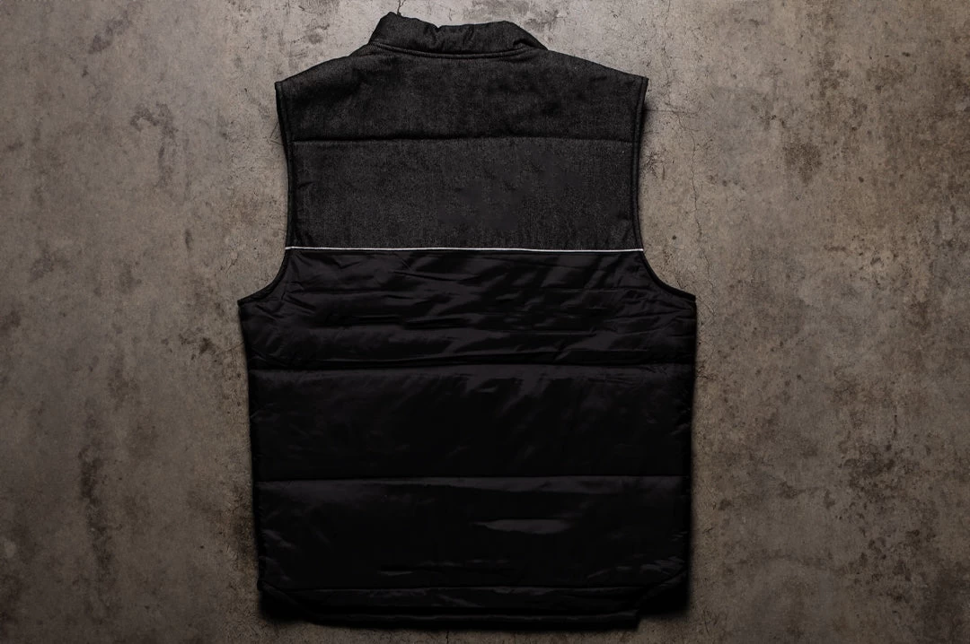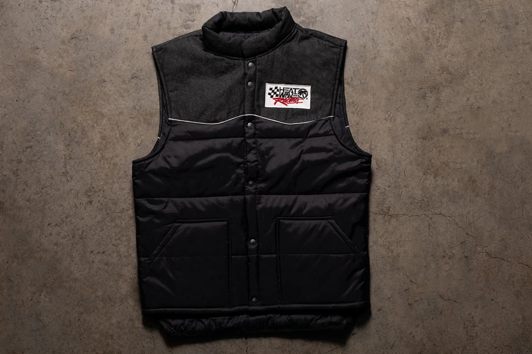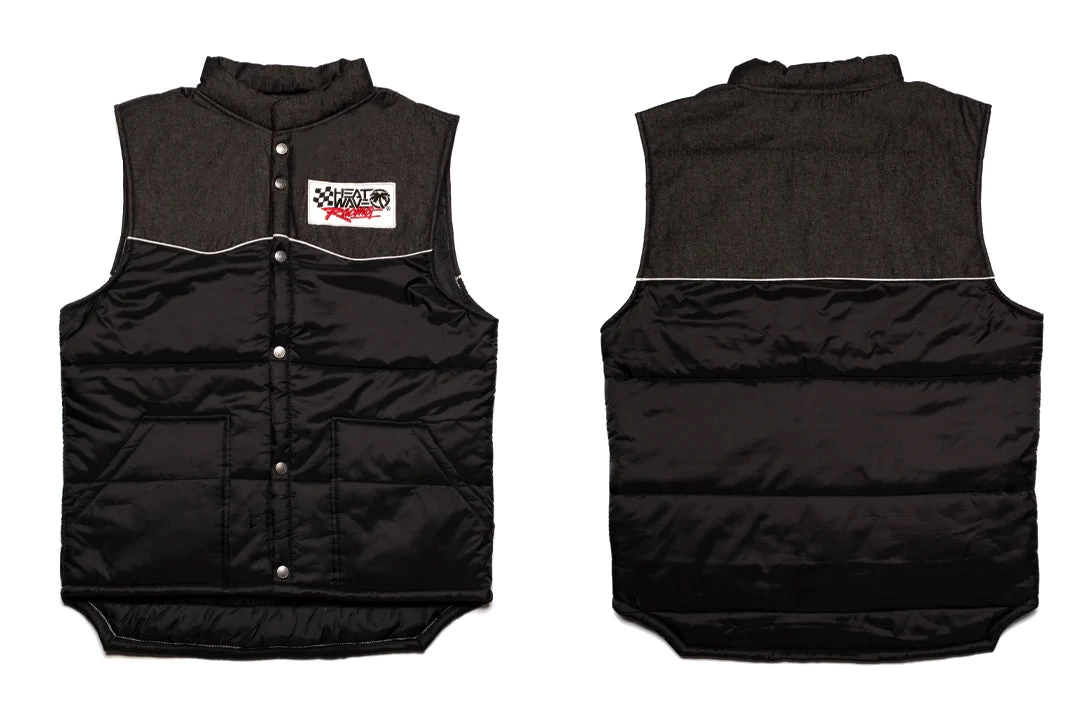 - The Cab Over vest is on top and geared for the long haul. A perfect layer piece that is simple, yet detailed down to the last button. This mid-weight vest features a black denim / nylon outer, with a nylon inner shell and poly fill. The vest is detailed with white piping, gun metal icon snap buttons and two hand pockets to rest your mitts in. The vest is completed with a trucker style Checker Racing patch embroidered on the chest. The end result is set to keep you warm, looking prime and pullin’ heavy from dusk ’till dawn.