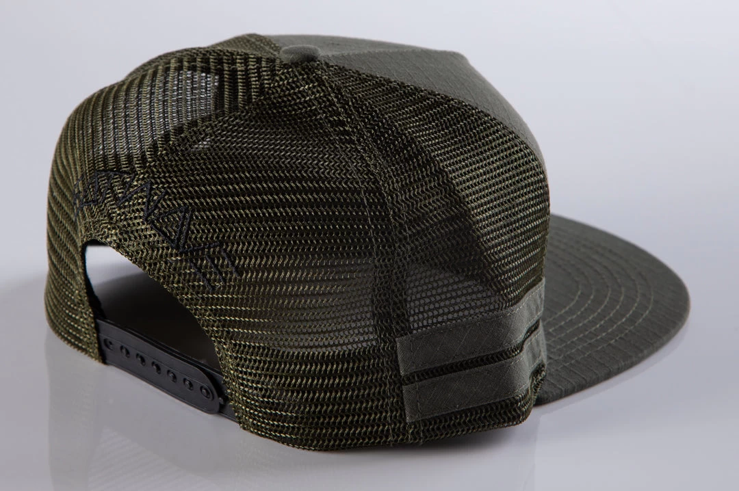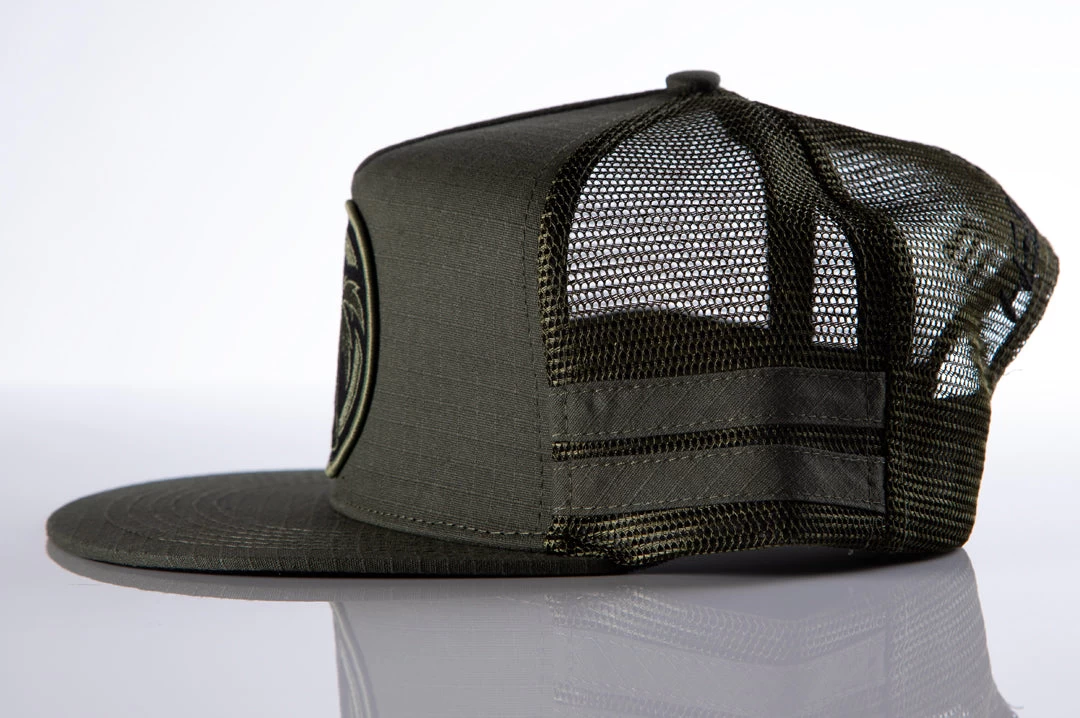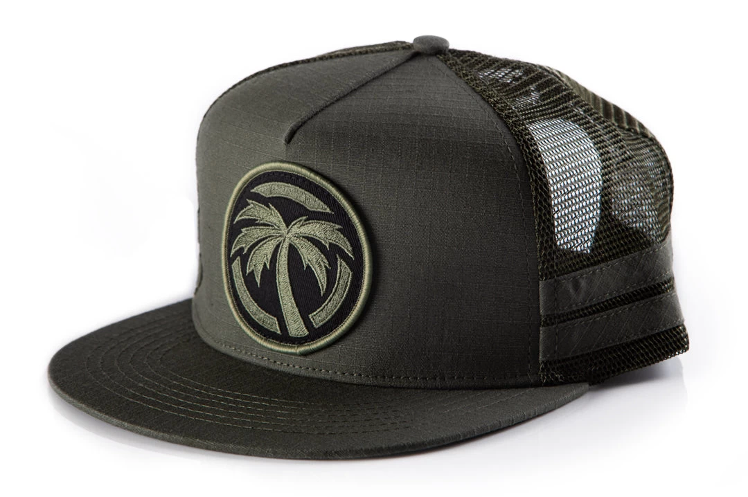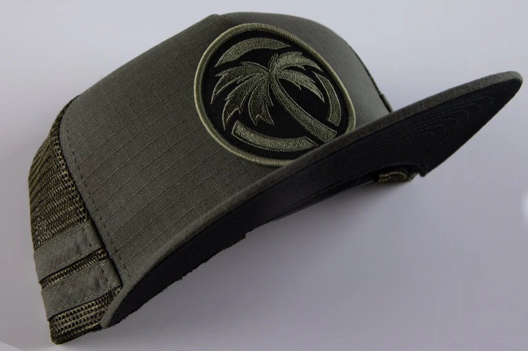 The SOCOM hat features the Palm Tree ICON logo embroidered dead center on the rip-stop OD Green 5 panel crown, and a Heat Wave spell out over the keyhole on the back. Tonal stripes on the side.