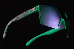 The Scribble Setup is built up with a mint green frame, ultra violet lenses and purple highlights. On the arms you will find the scribble graphic on an unique and bold, mint green arm.