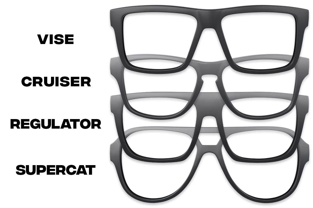 | Frame Style & Color | Apollo: Black, Apollo: Tortoise, Regulator: Black, Regulator: Tortoise, SuperCat: Black, SuperCat: Tortoise, Vise: Black, Vise: Tortoise, Vise: Vapor Clear, XL Vise: Black |